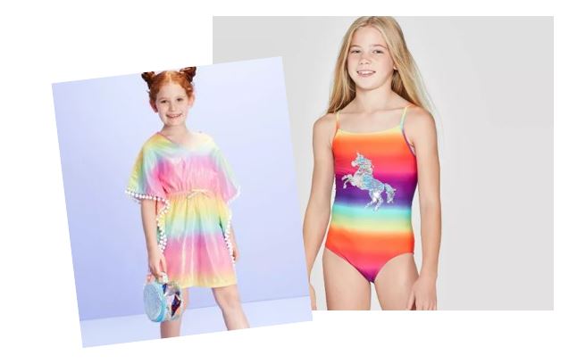 Girls’ Flip Sequin Unicorn One Piece Swimsuit and Girls’ Ombre Sparkle Swim Cover Up with Poms priced at $16.99