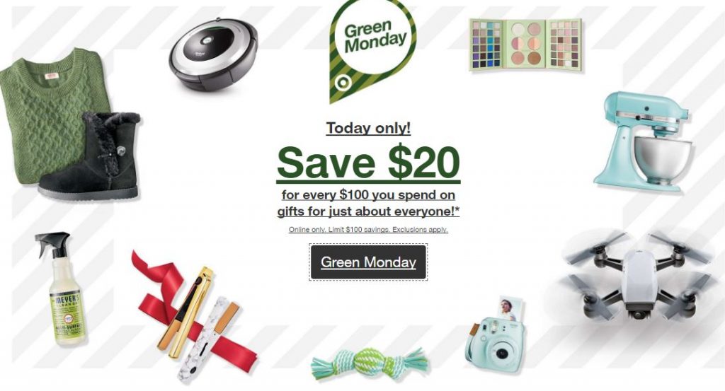 Today December 11, for Green Monday, Target is offering $20 off for every $100 you spend! No code is needed, the discount will be applied automatically, up to $100 total savings.