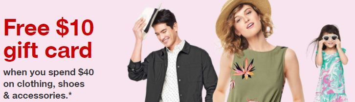 Through April 21st , Target is offering a $10 Gift Card with any $40 Apparel Purchase. This includes select men’s, women’s, baby and kids’ clothing, shoes and accessories.