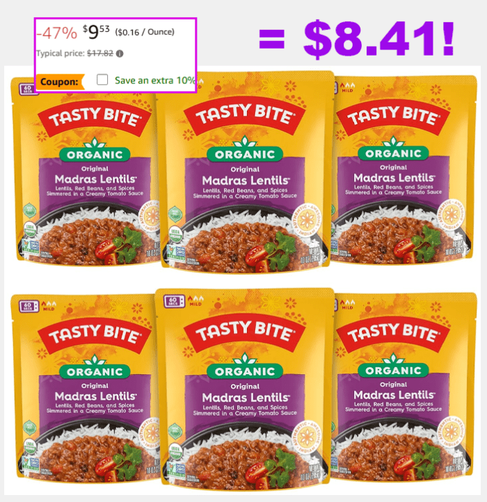 Tasty Bite Organic Madras Lentils, Pack of 6 for $11.21 (Reg $17.82)
