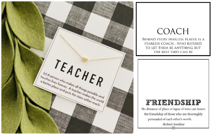 Teacher Appreciation Week will be here before we know it! These would be cute necklaces to give to your children’s teachers. There are also card choices for Coach, Friendship, Secretary, Graduate, and Principal. Choose from a silver or gold necklace.