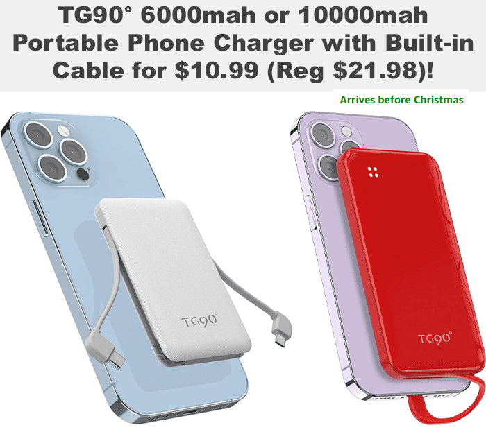 TG90° 6000mah or 10000mah Portable Phone Charger with Built-in Cable for $16.70 (Reg $21.98)!