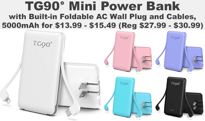 TG90° Mini Power Bank with Built-in Foldable AC Wall Plug and Cables, 5000mAh for $27.99 -$30.99