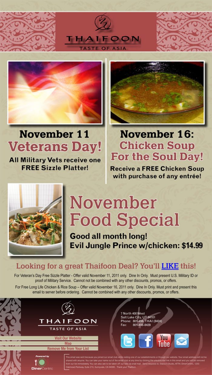 Thaiphoon Taste of Asia is my absolute favorite place to eat, I love love love their food! My favorites are the lettuce wraps and the sizzling salmon (with extra sauce). The Fillet Mignon they serve in the beef entrees is so tender it just melts in your mouth. No matter what I order I always leave room for dessert, they have a banana spring roll that is to die for! Take a look at these great specials that Thaiphoon is offering this month.