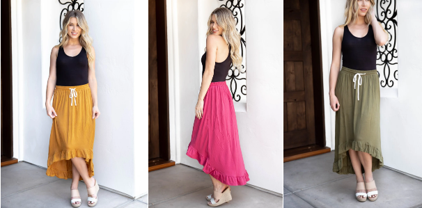 Add some sass to your daily wardrobe. This skirt features a beautiful high-low hem and ruffle detailing and would pair great with a basic tee and jean jacket for a fun casual look. Choose from 7 colors!