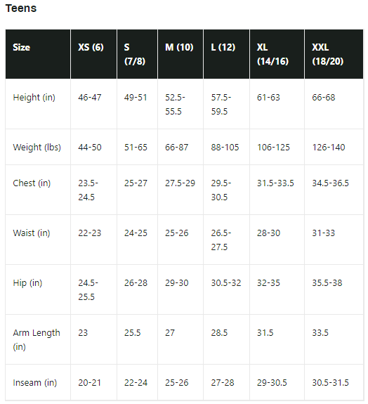 NOTE: This is TEEN sizing. Make sure you check the measurements and this size chart to get the correct size.