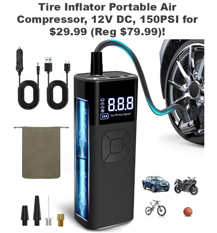 Tire Inflator Portable Air Compressor – 12V DC, 150PSI for $29.99 (Reg $79.99)!