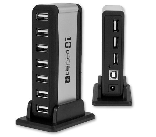 You’ve already connected your mouse and portable hard drive, but there’s no room for your cellphone and iPod. With the Titan High Speed 10 Port USB 2.0 Hub, you’ll never run out of space. The vertical design makes it easy to access all ten of the USB ports. Powered by an included AC adapter for high speed operation, the Titan USB hub allows simultaneous operation of up to 10 separate devices.