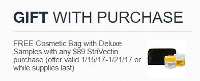 If you purchase $89 worth of StriVectin products, you’ll get a free Cosmetic Bag with Deluxe Samples, too!