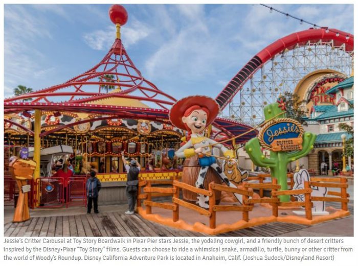 This all-ages ride is located in Disney California Adventure Park. Part of the Pixar Pier “neighborhoods,” Jessie’s Critter Carousel delights little cowboys and cowgirls who are fans of the Toy Story franchise. Hop aboard a little critter and take a spin before moseying over to Señor Buzz’s churro stand nearby.