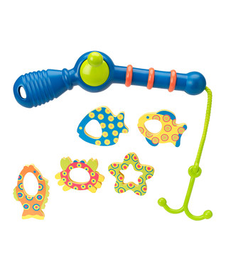 This fun fishing set features a reeling pole that hooks to floating foam fish pieces for catch and release adventures in the tub.