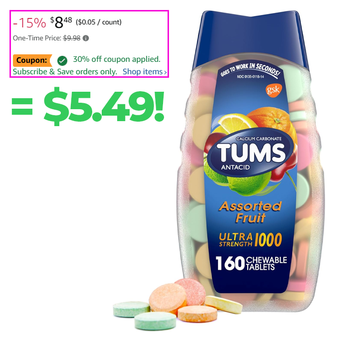 TUMS Ultra Strength Antacid Tablets, 160 Count for $9.98