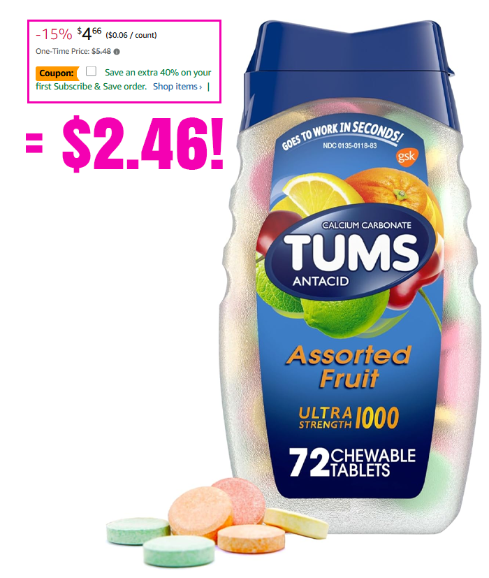 TUMS Ultra Strength Antacid Tablets, Assorted Fruit – 72 Count for $4.66 (Reg $5.39)!