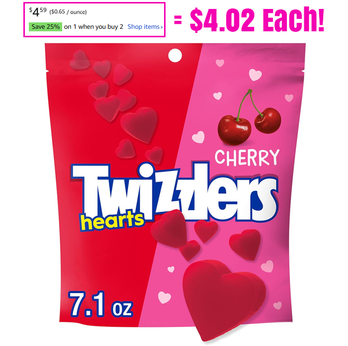 TWIZZLERS Cherry Flavored Hearts Chewy, 7.1 oz,2 for $4.59