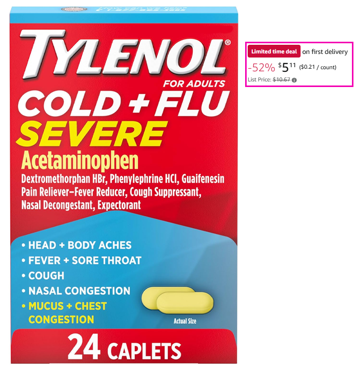 Tylenol Cold + Flu Severe Medicine Caplets for Cold & Flu Symptom Relief, 24 ct. for $5.68 (Reg $10.67)