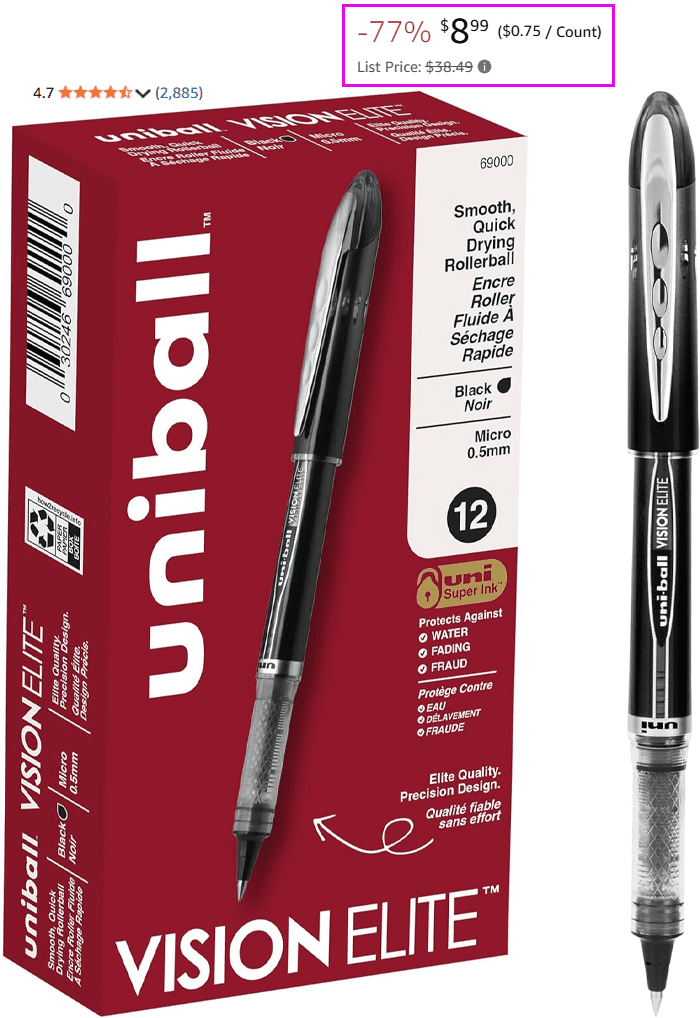 uni-ball Vision Elite Rollerball Pens Fine Point Micro Tip, 0.5mm, Black, 12 Pack for $9.99 (reg $22.49)