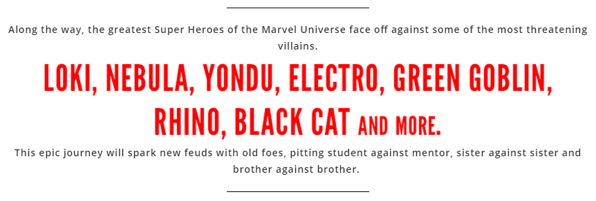 Called on by Doctor Strange, the Guardians of the Galaxy join Marvel Universe LIVE! Age of Heroes on a momentous crusade against the scheming Nebula who teams up with the conniving and loathsome villains Loki and Green Goblin. The incredible superhuman forces of Iron Man, Thor, Black Panther, Hulk and Black Widow will unite in clashes that pit student against mentor, sister against sister and brother against brother.