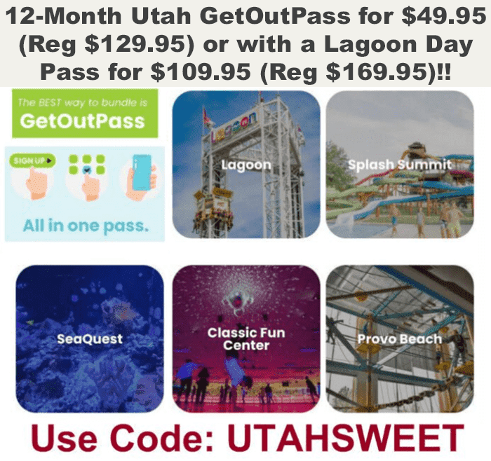 You can also get the 12-Month Utah GetOutPass without Lagoon a deal with our code. Regularly $129.95.