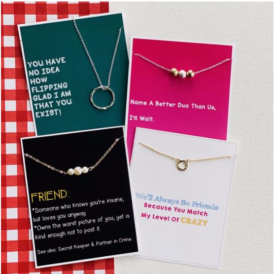 Find a cute necklace for your besties for Valentine’s Day! Choose from 4 card choices and a dozen necklace styles!