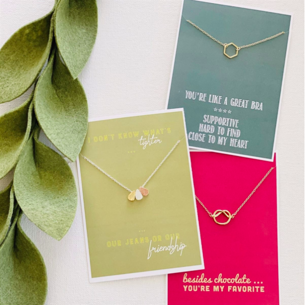Surprise those besties with a darling, chic necklace and hilarious gift card for Valentines’s day.