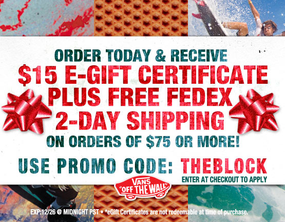 Receive a Free $15 eGift Certificate and Free FedEx 2-Day shipping on orders of $75 or more at Shop.Vans.com! Enter Code THEBLOCK at Checkout!