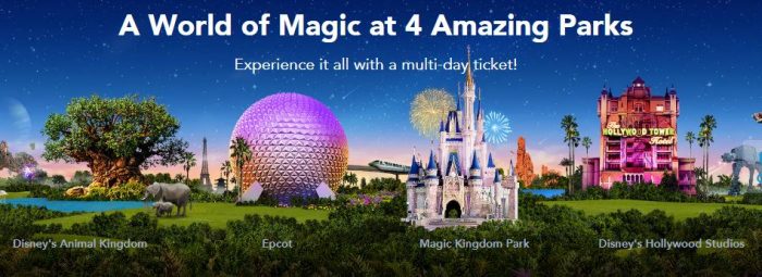 A 4-Park Magic Ticket includes one admission to each of the Walt Disney World theme parks (Disney’s Magic Kingdom park, Epcot, Disney’s Hollywood Studios and Disney’s Animal Kingdom theme park), for a total of 4 admissions. This ticket can be used to enter each theme park only once. Limit one admission per theme park, and one park per day.