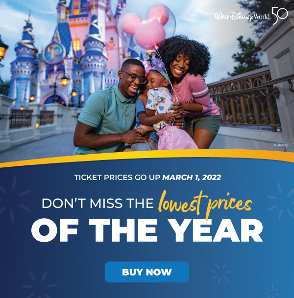 Heads up! Walt Disney World recently increased their ticket prices, but don’t worry! You can still lockin-in the old prices when you book with Get Away Today through March 1, 2022. You do need to know your travel dates, before you book, but now is definitely the time to get the most savings for the rest of the year. You can just purchase tickets now, or the Get Away Today Walt Disney World Resort Concierge Team would be happy to send you a quote on a vacation package including a hotel.