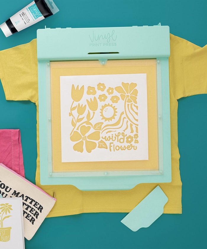 Get started on designing shirts or wall art using this vinyl screen printing press. It includes vinyl print press, three silkscreen frames, three pre-cut iron-on vinyl sheets, four 1-oz. screen print inks, color mixing chart and a squeegee.