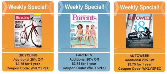 BestDealMagazines has some hot weekly specials going on! Get Bicycling, Parents, or Autoweek for just $3.75/year! Go here, and in the search box type in the title of the magazine. Make sure you use code WKLYSPEC at checkout to get the $3.75/year price.