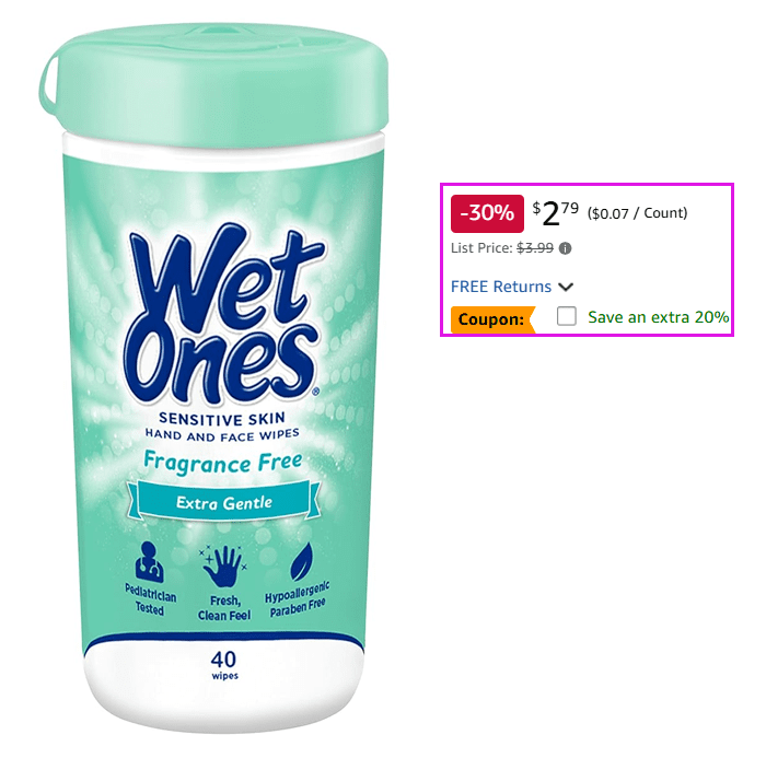 Wet Ones Hand and Face Wipes, Sensitive Skin, 40 Ct Canister for $3.28(Reg $3.99)