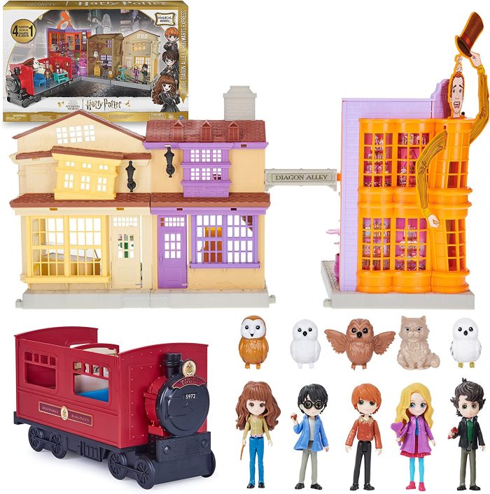 - AMAZON EXCLUSIVE SET: With 4 playset toys (Hogwarts Express, 3-in-1 Diagon Alley’s Weasleys’ Wizard Wheezes, Eeylops Owl Emporium and Florian Fortescue’s Ice Cream Parlour), 5 figures, 30+ accessories, lights and sounds, you can’t get this set anywhere else!