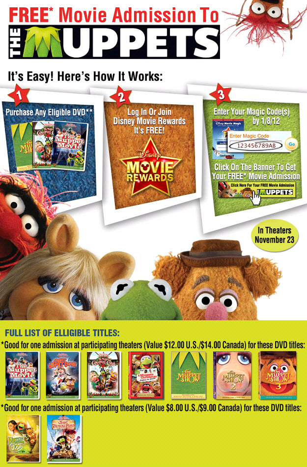 Buy any eligible Muppets title in the list below between November 4, 2011 and January 1, 2012 and receive a promotional code which you can redeem for a certificate valid for one admission (up to $12 value) to see The Muppets Movie between November 23, 2011 and January 8, 2012 at participating theaters.