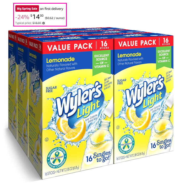 Wyler’s Light Singles To Go Powder Packets, Lemonade, 16 Count, 6 Boxes (96 Single Servings) for $15.05 (Reg $18.91)