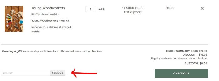 - When you go through this link, it will automatically give you 75% off. You will need to change the code to NEWCRAFT to get the lower price. To do that, click on the REMOVE button to remove the 75% off code and then enter in the new code.