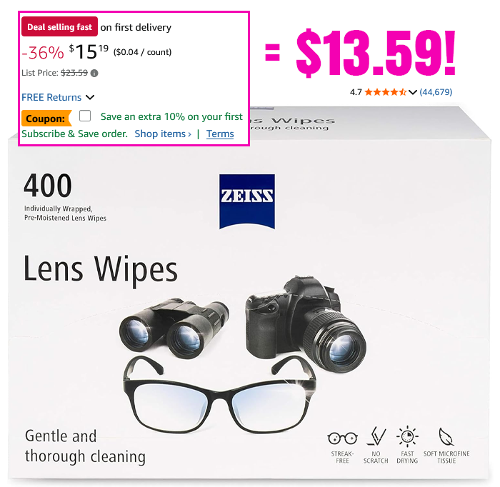 ZEISS Pre-Moistened Alcohol Wipes, Glasses Cleaner, 400 Count for $15.99 (Reg $23.59)!