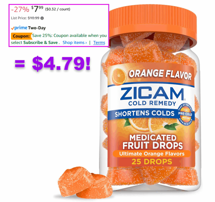 Zicam Cold Remedy Zinc Medicated Fruit Drops, Ultimate Orange, 25 Count for $4.79 (Reg $10.99)!