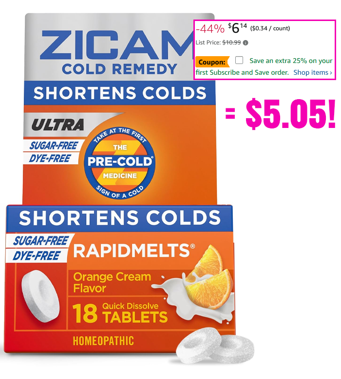 Zicam Ultra Cold Remedy Zinc Rapidmelts, Orange Cream Flavor, Sugar-Free, Dye-Free, 18 Count for $7.22 (Reg $10.99)