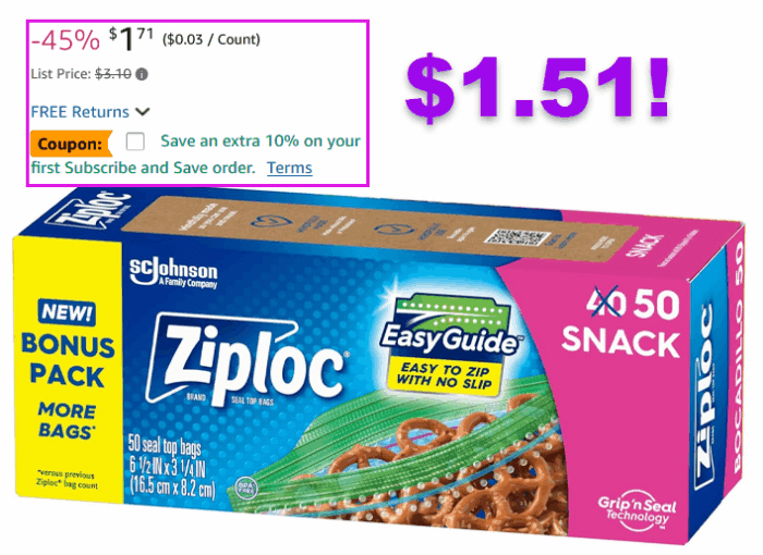 Ziploc Snack Bags with EasyGuide Texture, with Grip ‘N Seal Technology, 50 Bags Total for $2.01 (Reg $3.10)!